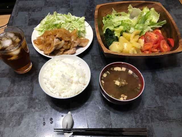 朝はサラダで80円、昼は1キロ3000円の素焼きミックスナッツを10gで30円、夕食は500円で1日約600円で食事をしています。お金が無いから健康的な食生活ができないという人がいますが、お金が無くても全然余裕でバランスの良い食事はできると思います。今回の夕食の豚の生姜焼きを鶏肉に変えたらもっと安く食べられますしね。
